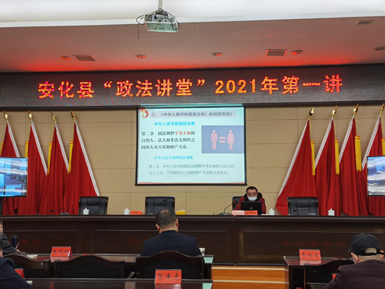 1月29日,县人大监察和司法委员会主任委员刘百战受县委政法委邀请,在安化县“政法讲堂”2021年第一讲课堂上为全县政法队伍讲授了《民法典》。 民法典是新中国成立以来第一部以“法典”命名的法律,被誉为“社会生活百科全书”。刘百战从民法典的概念、调整范围、编纂意义、立法过程、主要内容、基本原则等方面深入浅出地介绍了《民法典》,还对《民法典》中见义勇为、业主的建筑物区分所有权制度、农村土地“三权分置”制度、高空抛物、夫妻共同债务等20个亮点及热点话题进行详实的法理解读和案例分析,并就如何有力推动《民法典》的施行提出了自己的见解。 与会人员纷纷表示,本次课堂生动有趣,通俗易懂,让大家进一步认识了颁布实施《民法典》的重大意义,深刻掌握了《民法典》的内涵,将立足工作实际,做好执法、司法、普法各项工作,切实推动民法典贯彻实施,推动法治安化建设。  |