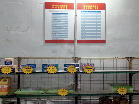 工作思路形成后,工作队和社区居支两委分片区召开屋场会,宣传道德积分管理和道德积分兑换超市的具体实施办法,广泛征求群众意见,组织党员、组长、议事会成员进行讨论,分片区召开居民大会表决通过了《唐市社区道德积分管理办法》,并予以公示。为使《办法》真正成为群众参与乡村振兴示范创建的载体,工作队和社区居支两委创建了道德积分兑换超市,居民可通过参与公益劳动、社区组织的人居环境美化、移风易俗等活动积累道德积分,再到社区道德积分兑换超市兑换一些日常生活用品。虽然道德积分兑换的日常生活小商品价值不高,但是对社区基层治理、人居环境美化、形成文明乡风产生了意义深远的积极作用。社区群众的集体荣誉感、社会责任感油然而生。