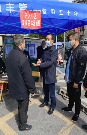 陈飞燕在东坪镇城西社区、城西家园小区检查疫情防控工作 陈飞燕每到一处都仔细查看疫情防控工作台账,要求相关单位切实担负起疫情防控政治责任,从严从实落实好疫情防控各项规定。他督导社区对社区居民全面摸排,对红黄码人员严格执行居家隔离、核酸检测、温度监测等防护措施;督导小区对进出人员严格执行三码同查、温度检测、佩戴口罩等防护措施;督导学校对全体教职工、学生及家长严格执行三码同查事前报告、温度检测、佩戴口罩接送等防护措施;督导卫生院落实落细核酸检测和疫苗接种等防护措施,确保打好打赢疫情防控阻击战。