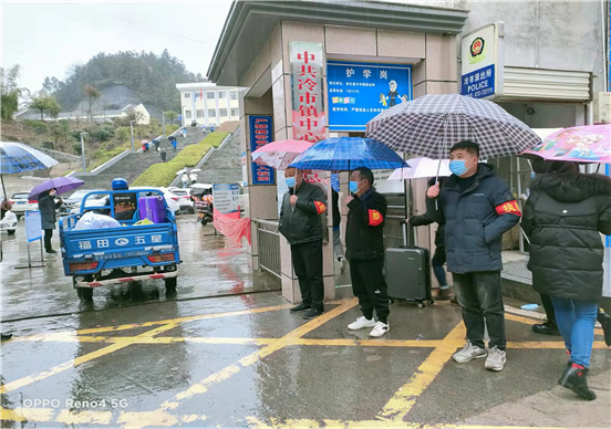 2月17日,冷市镇各学校正式开学,恰逢春雨霏霏,镇人大主席团组织各级人大代表、镇村两级干部到各学校维持开学秩序,指导疫情防控,督查校园安全。