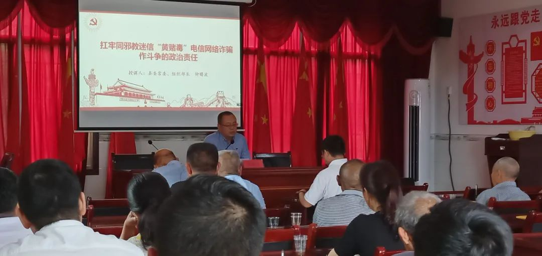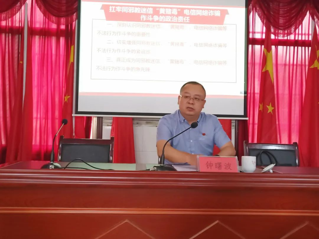 钟曙波为全体党员上了一堂题为《扛牢同邪教迷信“黄赌毒”电信网络诈骗作斗争的政治责任》的专题党课,用活生生的实际例子深入浅出的讲解了邪教迷信、“黄赌毒”、电信网络诈骗的含义、社会危害,提醒大家要深刻认识同邪教迷信、“黄赌毒”、电信网络诈骗等不法行为作斗争的重要性,切实增强同邪教迷信、“黄赌毒”、电信网络诈骗等不法行为作斗争的紧迫感。他强调,全体党员要从自身做起,敢作为、勇担当,真正成为同邪教迷信、“黄赌毒”、电信网络诈骗等不法行为作斗争的急先锋;要坚持人民至上做好宣传工作,提高群众法律意识和防范意识,保护群众财产安全,充分发挥党员干部先锋模范作用。