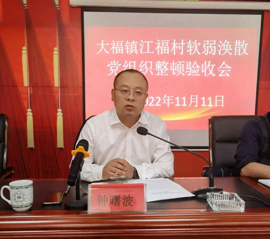 11月11日,大福镇江福村召开软弱涣散党组织整顿成效测评会,驻村工作队、镇村干部、党员和群众代表参加,联点领导县委常委、组织部部长钟曙波出席指导。
