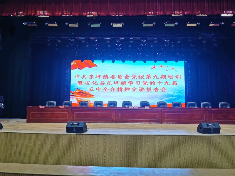 2021年2月6日,中共东坪镇委员会党校第九期培训暨安化县东坪镇学习党的十九届五中全会精神宣讲报告会在安化大剧院一号厅召开,东坪镇全体党政领导、镇机关全体干职工、驻镇部门单位负责人、新一届村(社区)“两委”成员、驻村帮扶工作队全体队员参加。