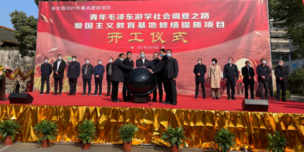 2月18日,安化县青年毛泽东游学社会调查之路——爱国主义教育基地修缮提质项目开工仪式在安化一中校园内举行,这是今年安化坚持项目为王、产业为要的开篇力作。安化县委书记刘勇会出席活动并致辞,益阳市文旅广体局党组成员、副局长罗卫荣宣布项目正式开工,县委副书记、县长肖义主持开工仪式。
