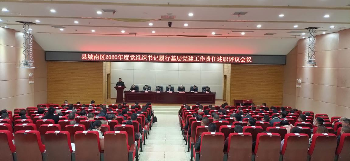 3月23日,县城南区召开2020年度党组织书记履行基层党建工作责任述职评议大会,党政领导、各部办室所负责人、村(社区)党组织书记、第一书记和驻村干部参与测评,机关干职工、各村(社区)“两委”成员、非公企业党支部和小区党支部书记列席会议。
