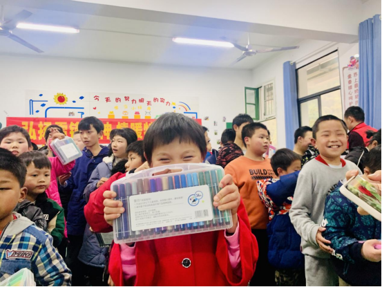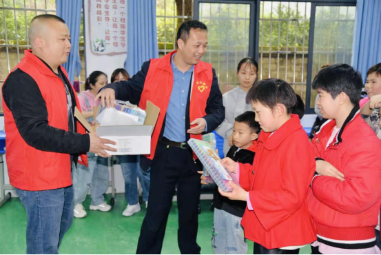 安化县征拆办负责人将彩色画笔送到孩子手中