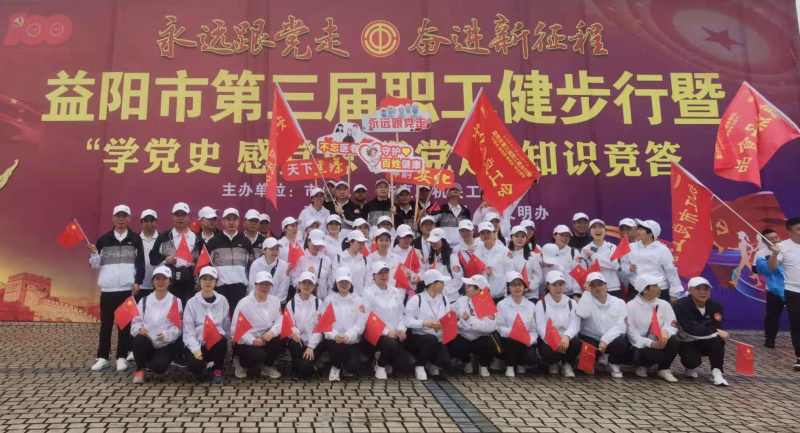 4月26日,“永远跟党走 奋进新征程”益阳市第三届职工健步行暨“学党史 感党恩跟党走”知识竞答活动在益阳奥林匹克公园北门广场盛大举行。来自各区县(市)总工会、市产业工会和市直属工会工作委员会各单位工会的共75支代表队5200余人参加活动,涵盖200余家企事业单位。 安化县代表队由55名来自县总工会和县人民医院的党员干部组成,选派3名党员参加“学党史 感党恩 跟党走”知识竞答现场答题活动。