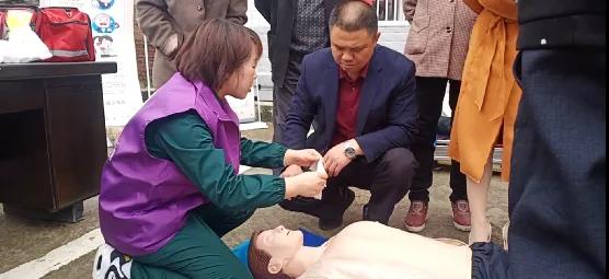 村干部张爱华与现场工作人员学习心肺复苏、人工呼吸等急救方法 |