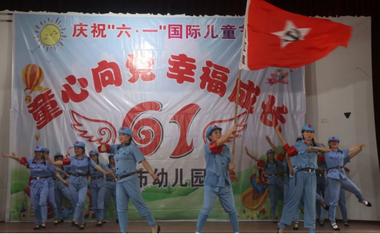 5月31日上午,洞市幼儿园在园长王海霞的组织安排下,举行了“童心向党、幸福成长”庆祝六·一儿童节的活动。孩子们、老师们、家长们欢聚在一起,共同庆祝第71个六·一国际儿童节的到来。 庆祝活动在全园操《感到幸福你就拍拍手》的音乐声中拉开序幕,孩子们随着音乐的节奏,拍着手跳着舞,脸上洋溢着被爷爷奶奶、爸爸妈妈陪伴的幸福。首先,洞市幼儿园老师们表演了《红色娘子军》舞蹈,她们身着军装的飒爽以及优美的舞姿博得了大家阵阵掌声。接下来,《花儿朵朵向阳花》《中华孝道》《最美中国娃》《祖国在我心中》《向爸爸看齐》《八百里洞庭我的家》等节目相继登台表演,赢得了所有家长的阵阵喝彩。 “童心向党、幸福成长”整台节目精彩纷呈,形式多样,所有的节目都与红色的中国有关。通过这样的庆祝活动,洞市幼儿园的老师们用以教寓乐的方式,向孩子们提供了一个展示自己的舞台,去参与、体验,全方位地展示了孩子们的活泼、可爱、幸福、快乐,更深层次地让孩子们感受到祖国的伟大、党的伟大、人民的伟大!