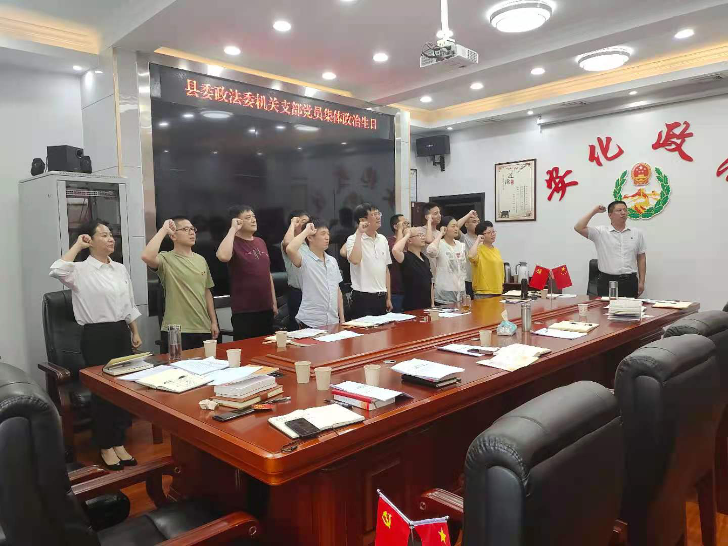 6月10日,县委政法委机关支部开展6月份主题党日活动,组织全体党员进行集中学习,并为一、二季度入党的党员集体过政治生日,让党员感受组织的温暖,强化党员身份意识、责任意识、宗旨意识,时刻牢记初心使命,全身心投入政法事业。 “今天是您的政治生日,在这神圣的日子里,希望您时刻牢记自己是一名共产党员……”机关支部书记为集体过政治生日的党员送上了祝福,激励党员牢记初心使命,砥砺担当精神,与时代同行,与单位共成长。 “我志愿加入中国共产党,拥护党的纲领,遵守党的章程……”全体党员重温入党誓词,再一次集体向党组织发出铿锵有力的誓言,表达了对党忠诚的赤诚之心,唱响了“政治生日”的主旋律。 “今天的幸福生活是无数英雄党员用义无反顾的牺牲换来的,没有共产党就没有新中国……””集体过政治生日的党员逐一谈感受,或分享自己的心路历程,或谈自己的成长经历,对党员自己来说是一次自我剖析,对其他党员来说则是一堂微党课,交流思想,追忆入党初心,始终坚定跟党走的信念。