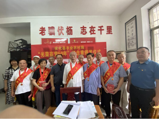 6月30日,县农业农村局举行“光荣在党50年”纪念章颁发仪式。党组书记、局长肖新华带领全体党员重温入党誓词,并向“光荣在党50年”优秀老党员代表颁发纪念章,局党组成员、副局长吴要辉、林敬田参加仪式。 肖新华向获得纪念章的老党员表示热烈的祝贺和崇高的敬意,向老同志们为农业农村事业所做的贡献表示衷心的感谢。他指出,老党员是党执政兴国的重要资源,是推进中国特色社会主义伟大事业的重要力量,他们用自己的实际行动见证了自己的无悔初心,纪念章的背后是无上的光荣,是永远的铭记。同时老同志是鼓舞年轻党员奋斗的灯塔,让广大党员干部始终牢记并践行党的初心使命,传承我们党的光荣作风和优良传统。 肖新华还向全体老同志通报了农业农村工作取得的成绩和特色亮点工作,并恳请老党员提出宝贵意见。老党员积极发言,除了表示对农业农村工作的肯定外,也提出了一些切实有效的建议。仪式最后开展了向离退休党员赠“四本书”活动,引导老党员认真学习党史,进一步坚定理想信念。