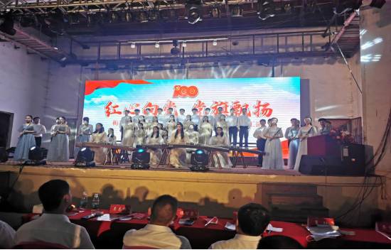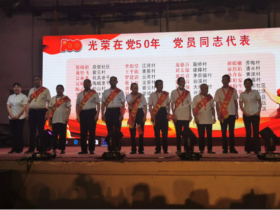 (《四渡赤水出奇兵》大合唱 (《我的祖国》乐器演奏) 表彰会上,为“光荣在党50年”党员代表颁发纪念章,梅城镇党委表彰了云河村等10个先进基层党组织、贺绵祖等100名优秀共产党员、肖佳麒等20名优秀党务工作者、安化县第一高级中学等10个2021年湖南省红色文化旅游节启动仪式筹备工作先进单位和周艳等10名2021年湖南省红色文化旅游节启动仪式筹备工作先进个人。激励全体党员干部以更加饱满的热情、更加积极的态度和更加过硬的作风,在各自的工作岗位上开拓创新、奋勇争先,再创佳绩、再立新功。