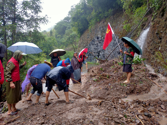 接到镇防汛指挥部紧急电话后,镇村两级干部第一时间赶往现场察看实际情况,果断决策,立即组织人员将邓东梁、邓桥梁、陈勇全3户转移至安全地带。7月3日凌晨5时许,在滂沱大雨中,值守太桥干溪冲地质灾害点的党员干部更是挨家挨户做工作,拍窗户、踹大门,把一户户居民“强行”叫醒,陆续转移了24户居民,共78人次。 共和三组公路塌方道路不通,党员干部、民兵救援队伍撑着雨伞,步行至组里,看到堵塞的地段,把裤脚往上一提,丢掉雨伞,一脚就扎进还在奔流着的泥水之中,用锄头挖开碎石,疏通出一条通畅的道路。处理完这些以后,大家也没有耽搁,立刻赶往下一个受灾点。