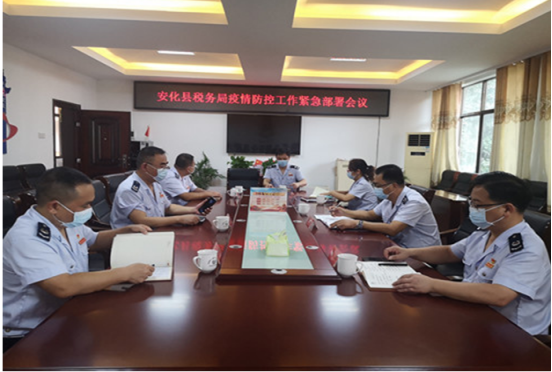 安化县税务局火速行动,成立了应对新冠肺炎疫情工作领导小组,按照上级部署,先后三次召开疫情防控专题会议,研究部署疫情防控工作,设立摸排组、督查组、信息组、后勤保障组4个工作小组,形成立体式工作架构,环绕落实具体措施,科学应对新冠疫情。